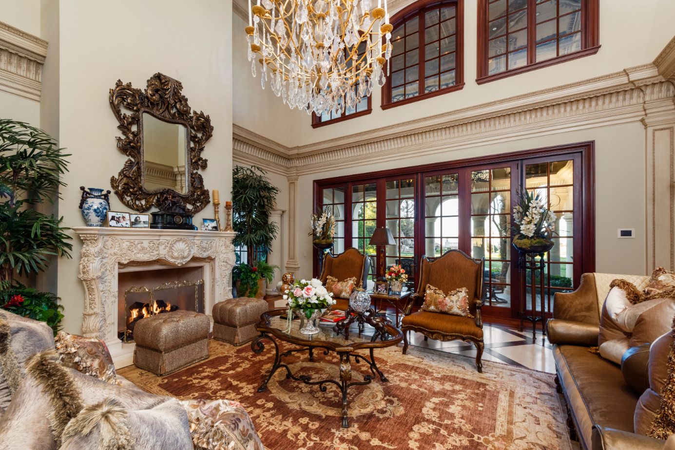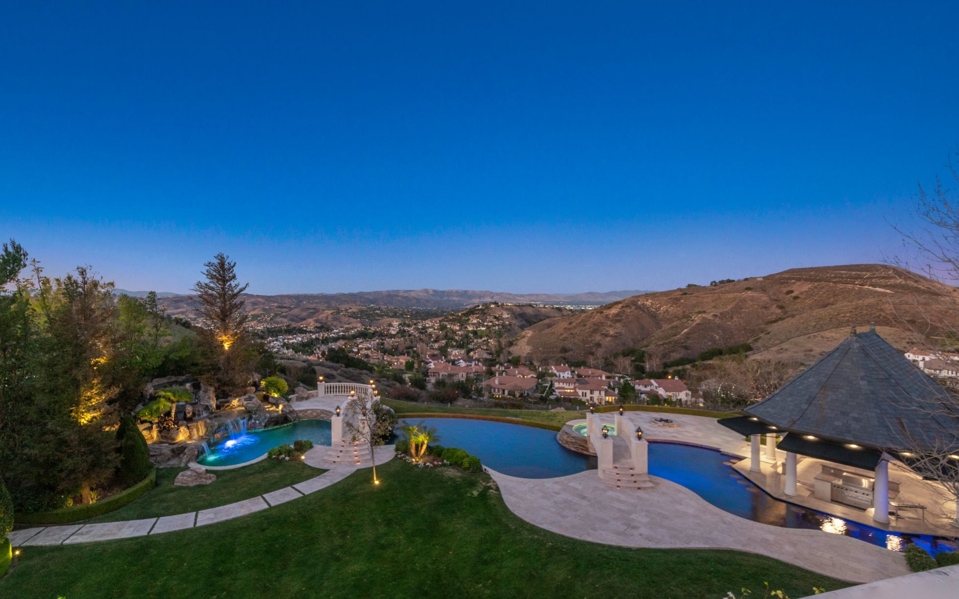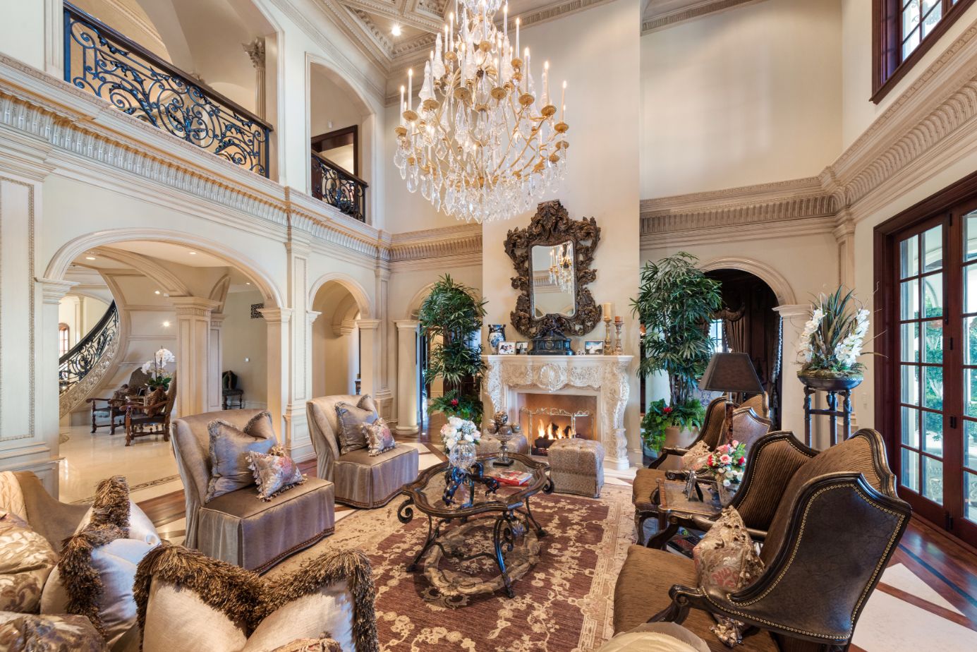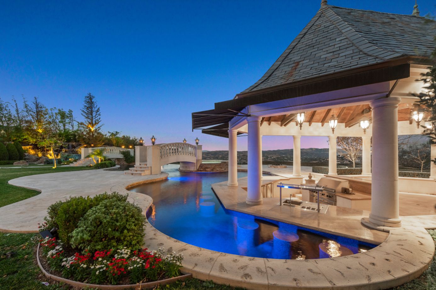 Introducing a world-class French Chateau showcasing the epitome of luxury living boasting ~17,000 square feet of architectural flourishes. Enter through the massive front doors into the dramatic 2-story foyer with a dome ceiling, breathtaking chandelier, stone floors, and a floating double staircase. Offering an unmatched living experience, the Chateau features 7 bedrooms, 10 bathrooms, several beautiful living rooms, formal and informal dining rooms a temperature-controlled wine room, theatre, wet bar, library, office, gym, game room, massage room, loft, and an elevator. A Groin Vault Ceiling and stone floors encapsulate the chef's kitchen outfitted with top-of-the-line stainless steel appliances and a large stone island. Distinguished features include exquisite hand-built French Chandeliers, soaring ceilings, hand-carved fireplaces, custom woodwork, limestone floors, solid mahogany doors and surround sound. The Master Suite is complete with a fireplace, sitting room, two massive walk-in closets, a steam shower, sauna, and two balconies showcasing views of the immaculate grounds and beyond. Breathtaking gardens with fruit trees and rose bushes surround the guest house, massive 110' Pebble Tec infinity-edge pool and spa with several water features, two bridges, fountain, patio areas with space heaters, fire pit, wood-burning fireplace, and a BBQ pavilion. Fully secured and operated by Crestron and Lutron Smart Systems, the home elevates the art of living and entertaining. Set behind gates, the property has garage space for 6 cars.